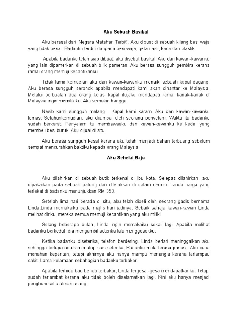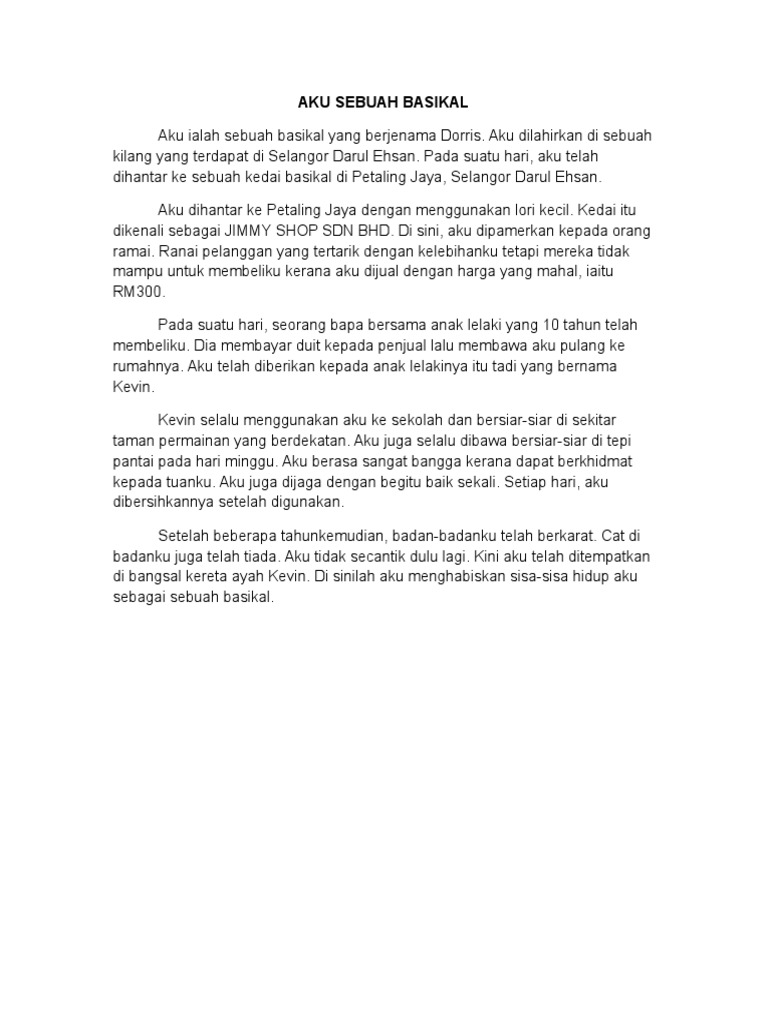Contoh Karangan Aku Sebuah Basikal Aku ialah sebuah basikal yang berjenama Dorris. Muat turun halaman 1-50 di AnyFlip. Aku dan kawan - kawanku yang lain dipamerkan di sebuah bilik pameran.
